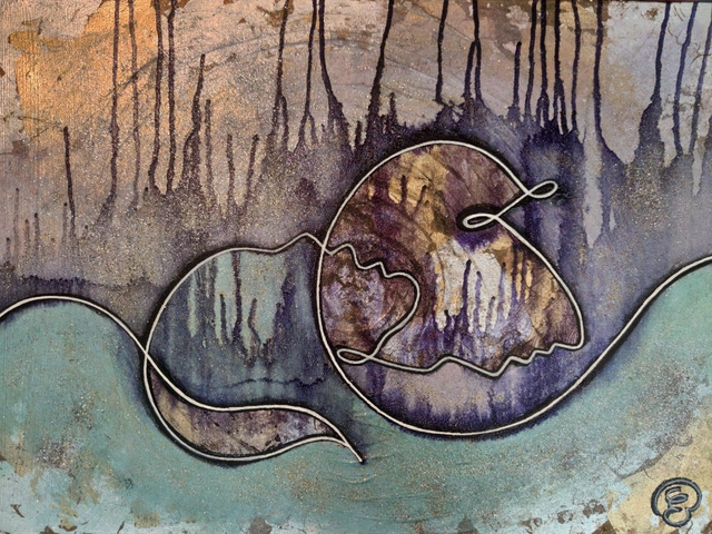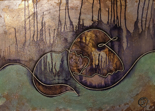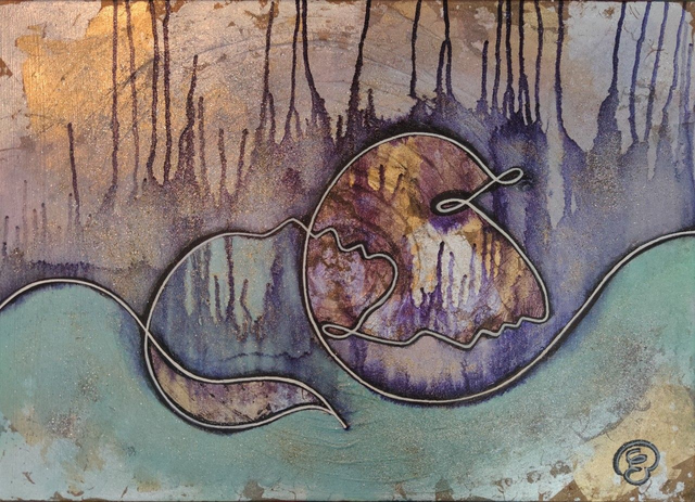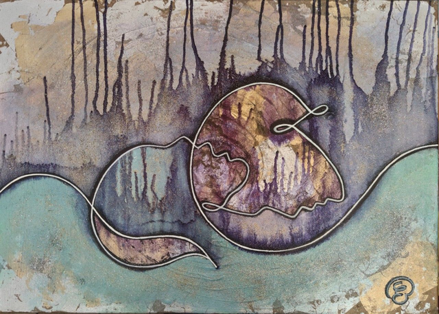 Colori acrilici, pennarelli, foglia oro/argento e polveri brillanti su tela, 70x50 cm, con cornice