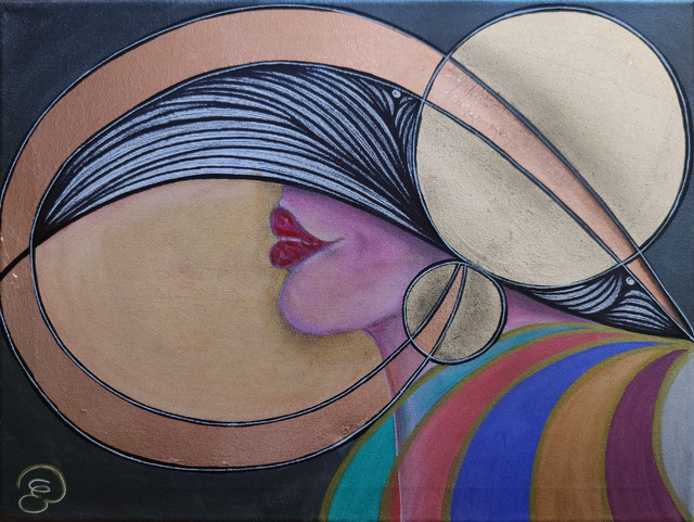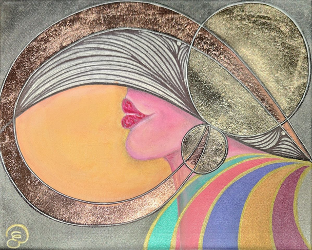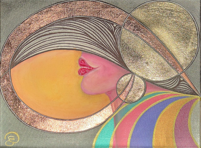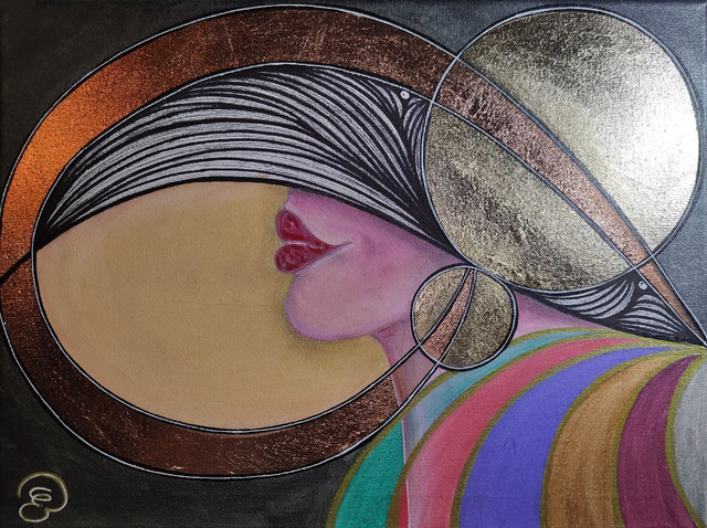 Colori acrilici, acquerelli, chine, foglia oro e bronzo su tela, 40x30 cm, con cornice
