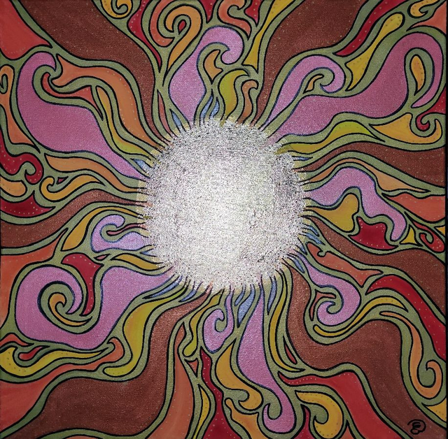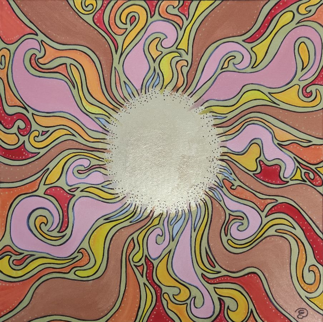 Colori acrilici, pennarelli e foglia oro su tela, 40x40 cm, con cornice