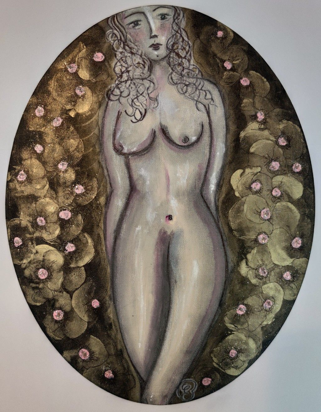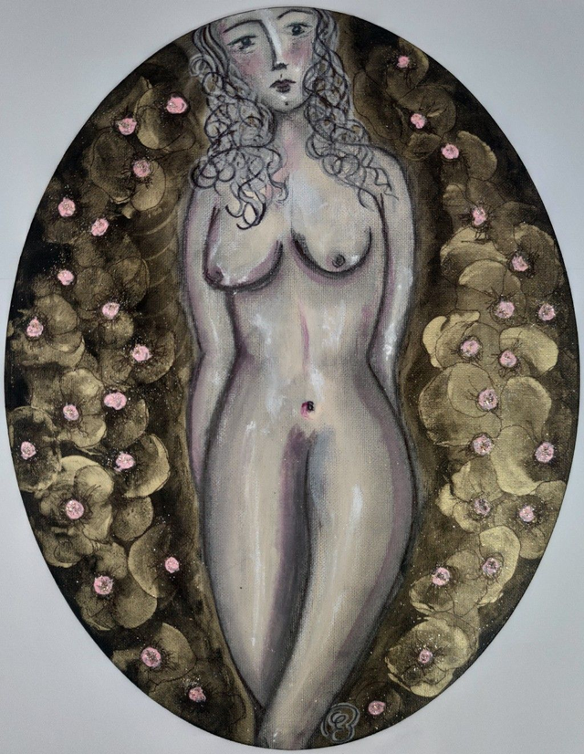 Acquerelli, colori acrilici e polveri colorate su cartone telato ovale, 30x40 cm, con cornice