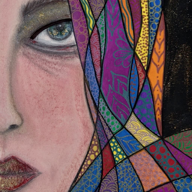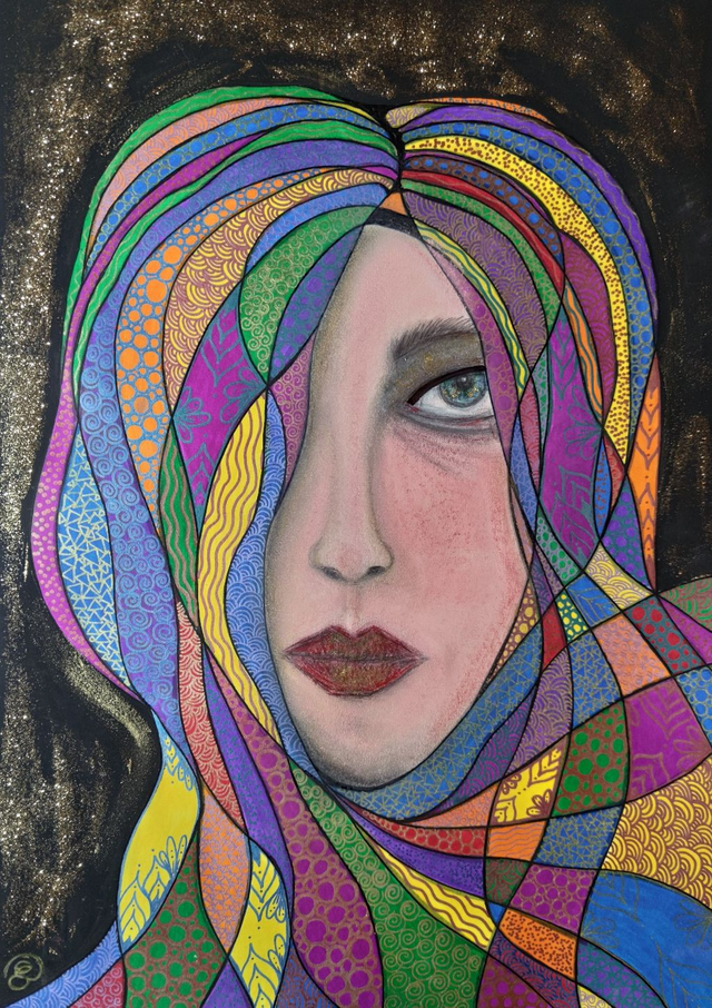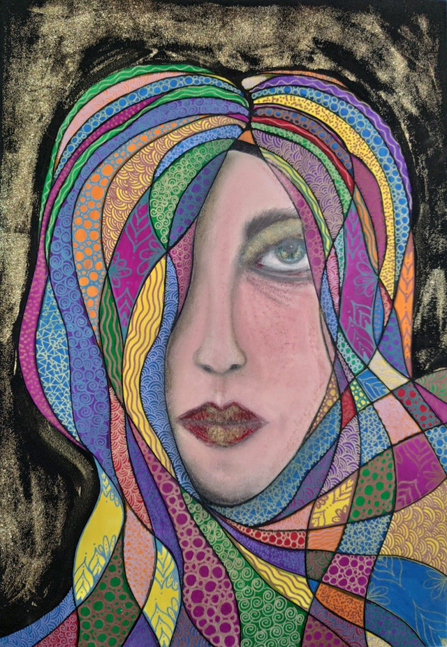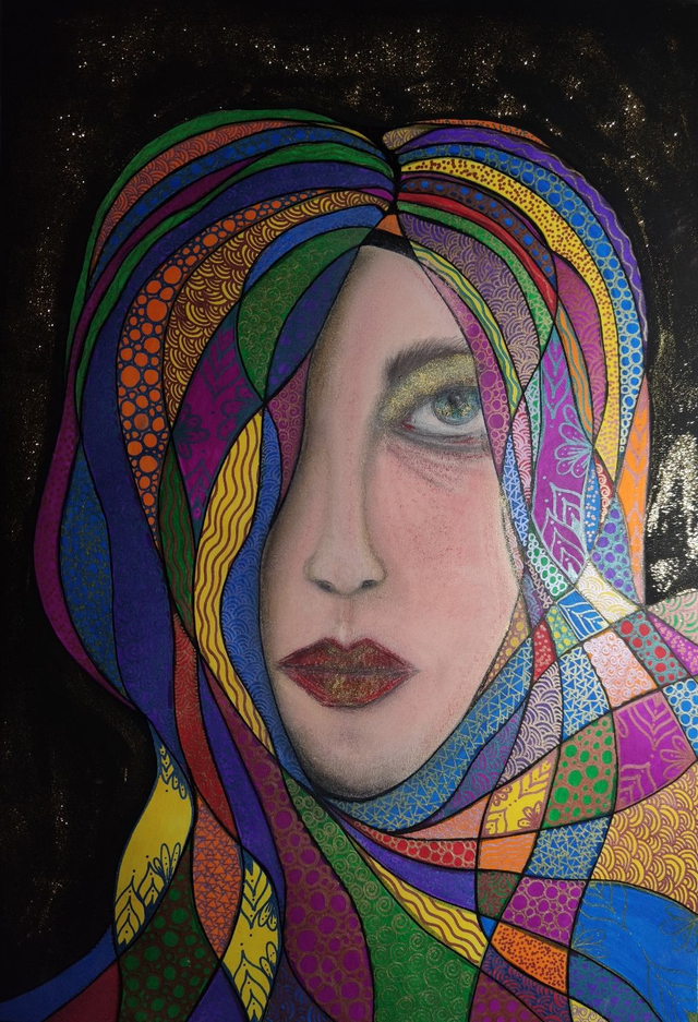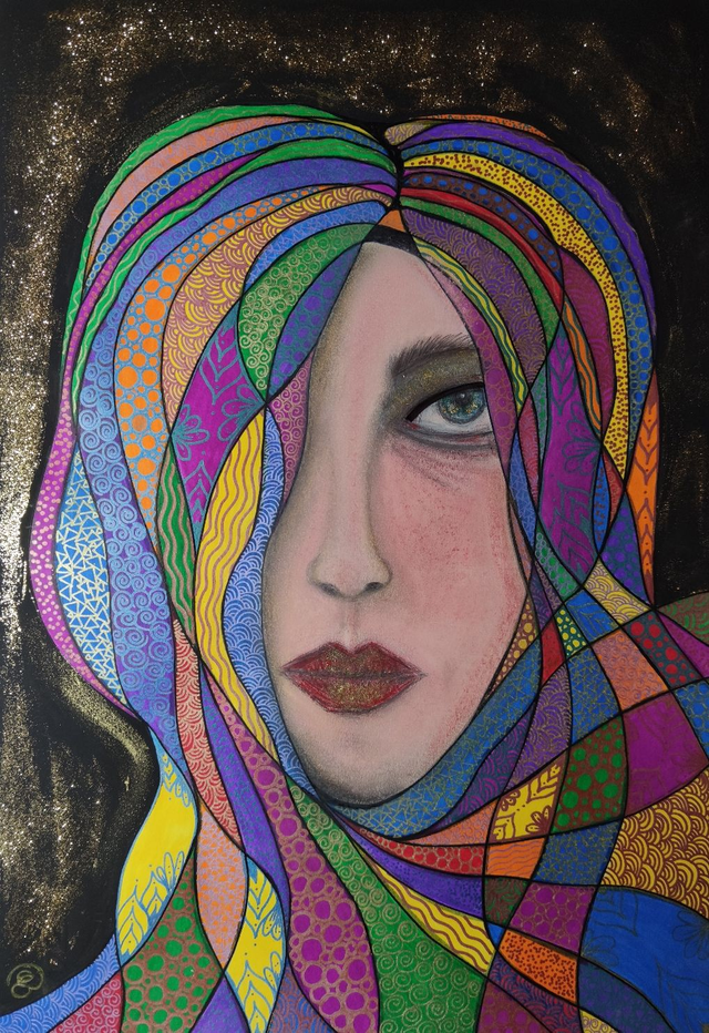 Colori acrilici, pennarelli e gessi colorati su cartoncino, 35x50 cm, con cornice